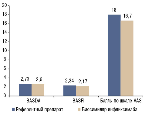 Согласно результатам другого многоцентрового клинического исследования, проводившегося в Болгарии, Чехии и Румынии, выявлено, что биосимиляр инфликсимаба является эффективным и обладает благоприятным профилем безопасности при применении в условиях рутинной медицинской практики [48]. В данном исследовании приняли участие 70 пациентов с АС, получавшие лечение в течение 24 нед. Эффективность терапии оценивали с использованием показателя BASDAI. Безопасность оценивали по количеству отмен назначенного лечения и нежелательным явлениям. В анализ эффективности были включены 62 пациента. Применение биосимиляра инфликсимаба у пациентов с АС статистически достоверно улучшило показатели пациентов по индексу BASDAI через 12 и 24 нед (p=0,0001 по сравнению с исходным значением для обеих точек времени). Показатели профиля безопасности также были сопоставимы для обоих препаратов. В исследовании, проведенном в Дании в условиях рутинной клинической практики, также изучали эффективность биосимиляра инфликсимаба по сравнению с референтным препаратом до/после замены последнего у пациентов с АС [49]. Для проведения данного исследования использовались данные Национального регистра DANBIO. В ходе исследования оценивали активность заболевания по шкале ASDAS (Ankylosing Spondylitis Disease Activity Score) за 3 мес до и через 3 мес после замены препарата у 279 пациентов в возрасте 44–66 лет. Замена препарата проведена для 199 пациентов с АС. Длительность наблюдения составила в среднем 413 дней. Пациенты получали референтный препарат в среднем в течение 6,8 (4,3–9,5) года до замены его на биосимиляр. Согласно результатам исследования, активность заболевания по шкале ASDAS за 3 мес до замены препарата составила 1,8 (1,2–2,6), во время замены препарата — 2,0 (1,4–2,6) и через 3 мес применения биосимиляра инфликсимаба сохранилась на том же уровне — 2,0 (1,2–2,9). Таким образом, установлено, что активность заболевания у пациентов с АС была сопоставима за 3 мес до/после замены референтного препарата на биосимиляр инфликсимаба. Аналогичные данные получены и для BASDAI. Подобные результаты зарегистрированы в норвежском исследовании NOR-SWITCH, проведенном в 2014–2015 гг., в котором приняли участие в том числе и 91 пациент с АС [50]. NOR-SWITCH представляет собой рандомизированное двойное слепое клиническое исследование, сравнивающее безопасность и эффективность замены референтного инфликсимаба на биосимиляр и продолжения лечения референтным инфликсимабом у пациентов с АС и другими заболеваниями, при которых показан инфликсимаб. Так, риск ухудшения течения заболевания в группе референтного препарата составил 39,5%, а в группе замены на биосимиляр — 33,3%. Доказано, что замена референтного препарата на биосимиляр инфликсимаба не приводила к ухудшению эффективности или профиля безопасности лечения (в заданном для биосимиляра пределе 15%). Результаты последних клинических исследований были объединены в ходе метаанализа, опубликованного в 2019 г., при проведении которого исследователи сравнивали профиль безопасности и эффективность препаратов при «переключении» между референтным препаратом и биосимиляром инфликсимаба у пациентов с воспалительными артропатиями, включая АС [51]. Всего проанализированы данные 113 статей и 149 тезисов, из них 70 признаны актуальными и включены в этот анализ. Большинство исследований были неконтролируем