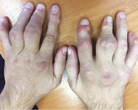 25.08.19 р. у хворого виник гострий подагричний напад, який супроводжувався болем та припуханням великого пальця правої стопи з підвищенням температури тіла до 38 °С. 26.08.19 пацієнт був оглянутий ревматологом. При огляді виявлено наявність тофусів у ділянці обох кистей та стоп (рис. 6, 7). Виконано рентгенографію кистей і стоп (рис. 8), контроль рівня сечової кислоти, консультацію нефролога та призначено лікування. ![]() Рис. 6. Тофуси в ділянці міжфалангових суглобів кистей