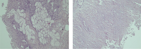 ![]() Рис. 8. Фрагмент шкіри з атрофією та субатрофією епідермісу, дезорганізацією та фіброзом сосочкового шару дерми, субатрофією придатків дерми, набряком та десквамацією ендотелію мікроциркуляторних судин, периваскулярно поодинокі лімфоцити у дитини А., 15 років (за даними аутопсії)