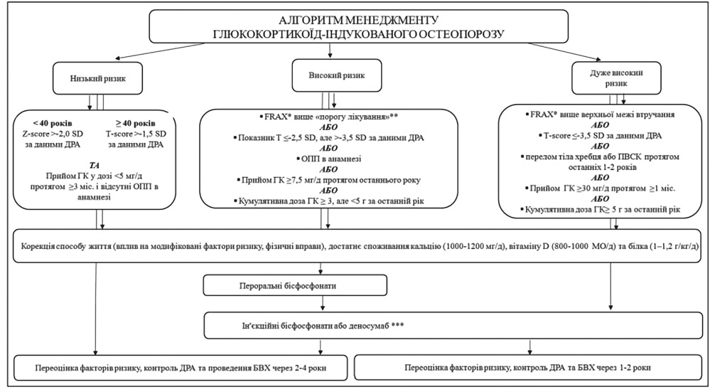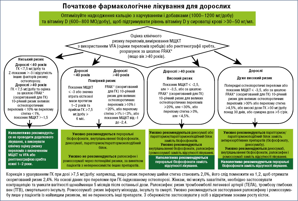 Патогенез ГК-індукованого остеопорозуПатогенез ГК-індукованого остеопорозу включає як прямі ефекти ГК на клітини кісткової тканини, так і непрямий системний вплив. Прямий вплив ГК пов’язаний з активацією гамма-рецептора-2, активованого пероксисомними проліфераторами (PPARγ2) та пригніченням сигнального шляху Wnt/β-катеніну. Перший механізм зумовлює диференціацію мезенхімальних клітин у адипоцити замість остеобластів, зменшує кількість остеобластів і посилює апоптоз остеобластів і остеоцитів. Другий механізм пов’язаний з підвищенням рівня склеростину, який блокує Wnt-сигналінг, що додатково гальмує остеобластогенез. Доведено, що відсутність склеростину у тварин зберігає цілісність кісткової тканини навіть на тлі надлишку ГК. ГК також підвищують резорбцію кістки, стимулюючи продукцію макрофагального колонієстимулювального фактора (M-CSF) та рецептор-активатора ядерного фактора κB ліганду (RANKL) і знижуючи рівень остеопротегерину, що веде до збільшення кількості та підвищення активності остеокластів. З часом цей ефект знижується через втрату остеобластів та остеоцитів. Непрямі механізми включають розвиток гіпогонадизму, зниження фізичної активності, абсорбції кальцію в кишечнику та збільшення його втрати через нирки, а також зниження продукції інсуліноподібного фактора росту-1 (IGF-1) і білків, що його зв’язують. До цього додається вплив основного запального захворювання, при якому призначають ГК: запальні цитокіни самі по собі зумовлюють резорбцію, і при рецидивах захворювання, незважаючи на терапію, ризик втрати кістки зростає. Надлишок ГК також викликає міопатію, знижуючи м’язову силу і підвищуючи ризик падінь [6]. Унаслідок цього якість кісткової тканини стрімко погіршується, і вже протягом 3–6 міс після початку лікування можуть з’явитися остеопоротичні зміни. У 30–50% пацієнтів, які довготривало приймають ГК, можливі патологічні переломи, спричинені підвищеною крихкістю кісток [1]. Лікування пацієнтів з ГК-індукованим остеопорозомЗгідно із сучасними міжнародними рекомендаціями, ведення пацієнтів, які отримують ГК, має включати як своєчасну оцінку ризику переломів, так і корекцію факторів, пов’язаних з основним захворюванням. Європейські настанови 2024 р. наголошують, що попередню оцінку ризику переломів слід регулярно проводити у всіх пацієнтів, які, ймовірно, отримуватимуть пероральні ГК протягом 3 міс і більше. Такий підхід є обов’язковим для жінок і чоловіків віком від 50 років, а також для осіб із підвищеним ризиком — зокрема за наявності в анамнезі переломів крихких кісток чи супутніх захворювань і терапії, асоційованої з остеопорозом [7]. Водночас у рекомендаціях Японського товариства досліджень кісток та мінералів 2023 р. підкреслюється, що першочергове значення має ефективне лікування основного захворювання, яке зумовило необхідність призначення ГК, адже це безпосередньо впливає на прогноз і темпи втрати кісткової маси [1]. Так, перевагу варто надавати призначенню мінімально необхідної дози ГК, застосовуючи стероїдзберігаючі препарати, як-от метотрексат чи азатіоприн, або ж альтернативні шляхи введення ГК (наприклад інгаляційно чи місцево), якщо це доцільно. У підтримці ремісії, за можливості, варто надавати перевагу нестероїдним протизапальним препаратам (НПЗП). Водночас важливо зберігати контроль н