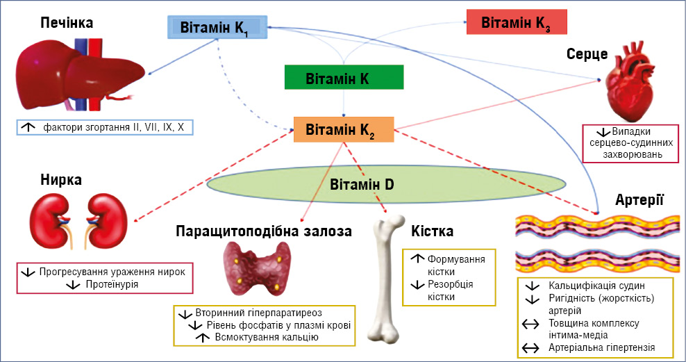 Примітки: ОПП — остеопоротичні переломи; ДРА — двохенергетична рентгенівська денситометрія; FRAX (fracture risk assessment tool) — 10-річна ймовірність основних ОПП; БВХ — бокова візуалізація хребта; SD — стандартне відхилення; *розрахунок FRAX з урахуванням дози ГК; **показник FRAX після переоцінки з урахуванням показників ДРА; ***1-ша лінія терапії за умови дуже високого ризику, 2-га лінія терапії за умови високого ризику ОПП. На окрему увагу заслуговують добавки вітаміну K2, які можуть покращувати якість кісткової тканини та знижувати ризик переломів у пацієнтів з остеопорозом, підвищуючи ефект кальцію та вітаміну D. Тісний взаємозв’язок між вітаміном D та різними формами вітаміну K (рис. 2) [16] має важливе значення для регуляції функції паращитоподібної залози, підтримки цілісності кісткової тканини та стану артерій; при цьому вітамін K2 особливо важливий для збереження здоров’я кісток і профілактики остеопорозу. Він підвищує γ-карбоксилювання остеокальцину — основного неколагенового білка кістки, завдяки чому остеокальцин ефективніше зв’язує кальцій з гідроксиапатитом, сприяючи формуванню кісткової тканини та запобігаючи відкладенню кальцію й фосфату у м’яких тканинах. Крім того, вітамін K2 є кофактором γ-карбоксилювання матричного Gla-білка, переводячи його з неактивної форми в активну, яка запобігає кальцифікації м’яких тканин. Підвищений рівень неактивного матричного Gla-білка у крові свідчить про дефіцит вітаміну K та пов’язаний з накопиченням кальцію у судинах, жорсткістю артерій і атеросклерозом [17]. Метааналіз 19 рандомізованих контрольованих досліджень показав, що у жінок з остеопорозом лікування вітаміном K2 значно підвищує МЩКТ хребців як у середньо- (6 міс), так і в довгостроковій перспективі (≥1 року) [20]. Дані систематичного огляду (рівень доказовості I) свідчать, що вітамін K2 запобігає переломам хребців на 60%, переломам стегна — на 77% та позахребцевим переломам — на 81% у пацієнтів японського походження [21]. Результати досліджень K. Ebina та співавторів (2013) і M.S. Abdel-Rahman та співавторів (2015) продемонстрували позитивний вплив вітаміну K2 на зниження активності маркерів запалення та деструкції у пацієнтів з ревматоїдним артритом (РА). Зокрема, додавання вітаміну K2 у дозі 45 мг/добу протягом 3 міс у хворих на РА та зниженою МЩКТ супроводжувалося полегшенням перебігу захворювання та зниженням рівня С-реактивного білка (СРБ) і матриксної металопротеїнази-3 (ММП-3) [20]. Аналогічно, застосування вітаміну K2 у дозі 100 мкг/добу асоціювалося зі зниженням рівня СРБ, ММП-3, швидкості осідання еритроцитів (ШОЕ), недокарбоксильованого остеокальцину, а також активності захворювання у пацієнтів з РА [21]. ![]() Рис. 2. Потенційна роль вітаміну К у функціонуванні печінки, нирок, паращитоподібної залози, кісток, артерій та серця. Також зображено потенційний синергізм з вітаміном D (на паращитоподібну залозу, кістки та артерії).