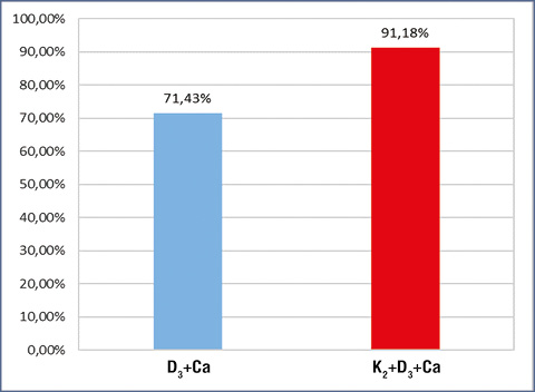 Дані іншого дослідження свідчать, що додавання вітаміну K2 до стандартної терапії кальцієм і вітаміном D3 у пацієнтів, які перенесли операцію на хребті з приводу поперекового міжтілового спондилодезу та заднього поперекового міжтілового спондилодезу, покращує консолідацію хребців на 21,6% та запобігає подальшому зниженню МЩКТ протягом 6 міс (рис. 3) [22]. У 6-місячному рандомізованому дослідженні за участю жінок у постменопаузальний період віком старше 60 років додавання вітаміну K2 до терапії вітаміном D та кальцієм зумовило значуще підвищення МЩКТ L3 та зниження рівня недостатньо карбоксильованого остеокальцину [23]. ![]() Рис. 3. Результати оцінки за даними КТ щодо впливу додаткового прийому вітаміну K2 протягом 6 міс на прискорення консолідації хребців після операції на хребті (трансфорамінального або заднього поперекового міжтілового спондилодезу) [22]