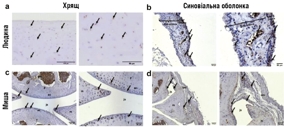 GLP-1 як новий напрям у лікуванні остеоартритуІнноваційна доповідь професора Френсіса Беренбаума була присвячена перепрофілюванню аналогів глюкагоноподібного пептиду-1 (GLP-1) для лікування остеоартриту. Дані доклінічних та ранніх клінічних досліджень свідчать, що ці препарати можуть виявляти не лише анальгезивний, а й хондропротекторний ефект [22]. Імуногістохімічний аналіз показав експресію GLP-1R у хондроцитах колінного хряща та синовіальній мембрані пацієнтів з остеоартритом, зокрема в інтимі та ендотелії судин (рис. 2). Аналогічні результати отримані у мишачих моделях — у хрящі, меніску, кістковому мозку та синовіальних клітинах. Сукупно ці дані підкреслюють потенційно ключову та плейотропну роль GLP-1R у фізіології та патології колінного суглоба. ![]() Рис. 2. Імуногістохімічна локалізація GLP-1R у хрящі та синовіальній оболонці людини і миші