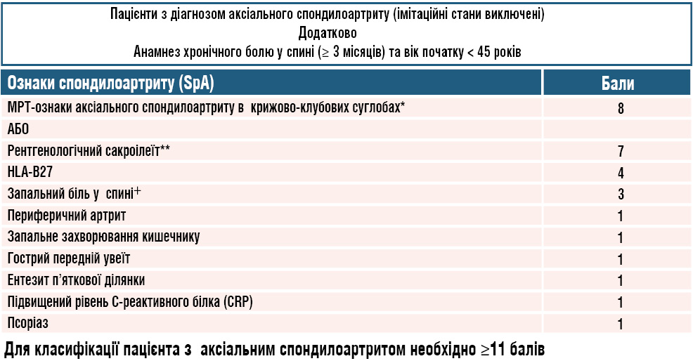 Примітки: ac — суглобовий хрящ, js — суглобова щілина, m — меніск, sm — синовіальна мембрана, F — стегнова кістка, T — великогомілкова кістка, Sub-intima — підінтимальний шар. Стрілки вказують на позитивне імуногістохімічне забарвлення / клітини-мішені. 50 μm, 100 μm — 50 мкм, 100 мкм (масштаб). Виявлення GLP-1-рецепторів у хондроцитах і синовіальних клітинах, а також позитивні результати доклінічних моделей стали підґрунтям для клінічних досліджень внутрішньосуглобового введення аналогів GLP-1 [23, 24]. Поточні дослідження фази 2 спрямовані на оцінку впливу на біль, функцію та структурні зміни суглоба, що відкриває перспективу появи першої хворобомодифікуючої терапії остеоартриту. Дослідження має багатонаціональний дизайн із залученням клінічних центрів у Канаді (3 центри), Європі (16 центрів в Іспанії, Франції, Польщі та Данії) та США (2 центри, відкриття яких очікувалося до кінця 2025 р.) і спрямоване на оцінку ефективності втручання щодо зменшення вираженості болю та впливу на синовіальне запалення при середньо-тяжкому та тяжкому остеоартриті колінного суглоба. Очікується, що результати будуть отримані у 2026 р. У разі успіху планується розпочати ключове дослідження фази 2b у 2027 р. з перспективою прискореного регуляторного схвалення. «Нашою стратегічною метою є максимально швидке впровадження цього підходу в клінічну практику та надання пацієнтам доступу до нової терапії до 2030 р.», — зауважив спікер. Сучасне бачення осьового спондилоартриту: роль МРТ і нові критеріїВиступ професора Володимира Максимовича був зосереджений на перегляді підходів до класифікації осьового спондилоартриту (рис. 3). Наголошено, що нові критерії, розроблені міжнародною експертною групою, забезпечують значно вищу специфічність без втрати чутливості, що має принципове значення для клінічної практики [25]. ![]() Рис. 3. Переглянуті критерії класифікації ASAS-SPARTAN для аксіального спондилоартриту у форматах