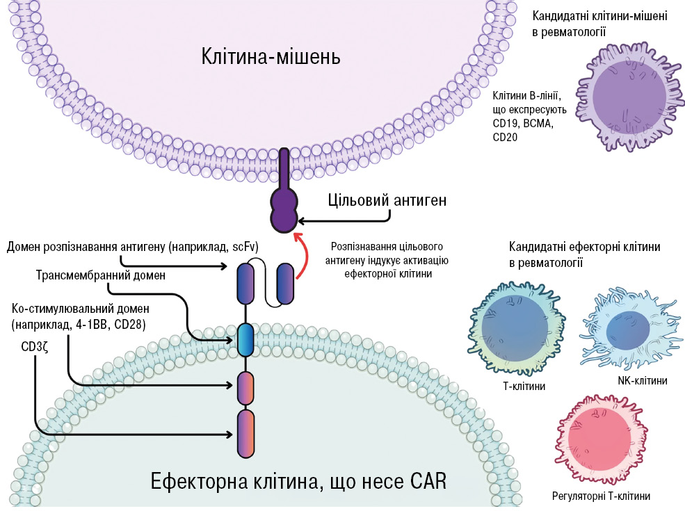 Підкреслено, що CAR-T-клітини розпізнають CD19-позитивні В-лімфоцити незалежно від головного комплексу гістосумісності, що забезпечує високу селективність і потужний цитотоксичний ефект (рис. 4) [29]. ![]() Рис. 4. Основна структура та функція CAR-терапії, що використовується в ревматології
