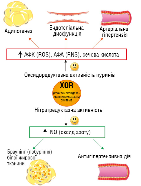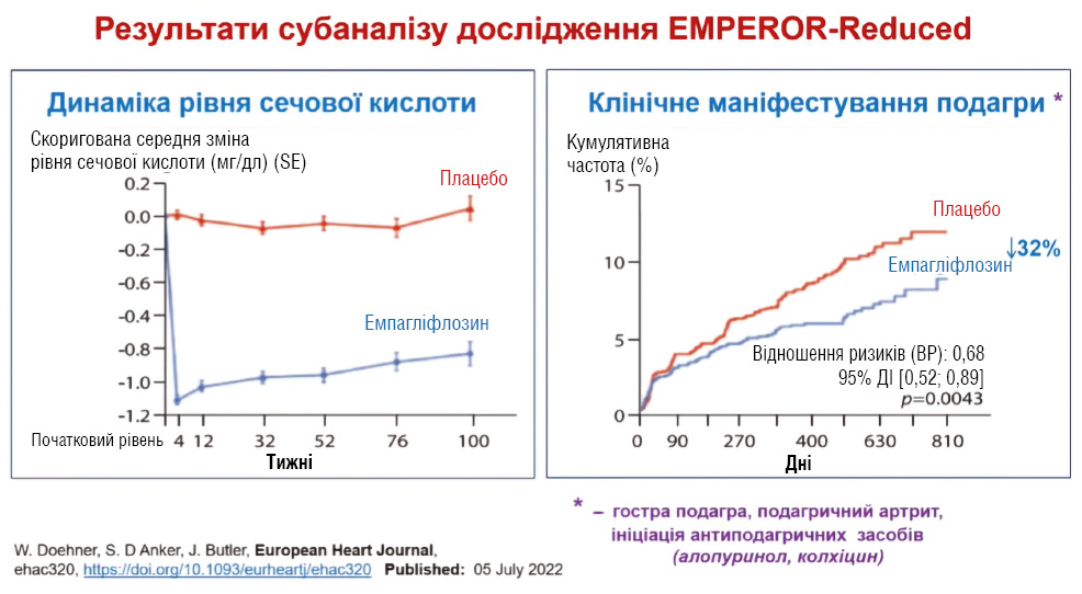 Приміки: АФК — активні (реактивні) форми кисню; АФА — активні (реактивні) форми азоту. Таким чином, терапія у пацієнтів із подагрою та серцево-судинною патологією потребує обережного та індивідуалізованого підходу. Інгібітори ксантиноксидази не повинні застосовуватися рутинно, НПЗП та глюкокортикостероїди погіршують серцево-судинний прогноз, тоді як колхіцин має доведену користь у пацієнтів з ішемічною хворобою серця. Інгібітори натрійзалежного котранспортера глюкози 2-го типу (SGLT2), зокрема емпагліфлозин та дапагліфлозин, знижують рівень сечової кислоти, ризик подагричних атак та достовірно покращують серцево-судинний прогноз, поєднуючи антиоксидантний та протизапальний ефект (рис. 7) [44, 45]. ![]() Рис. 7. Вплив емпагліфлозину на рівень сечової кислоти та частоту клінічно значущих гіперурикемічних подій порівняно з плацебо