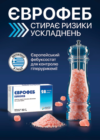 Резюме. Мета: вивчити ефективність уратзнижувальної терапії, а саме фебуксостату у пацієнтів із подагрою. Матеріали та методи. У дослідження було залучено 85 пацієнтів (73 чоловіки, 12 жінок) віком 47–57 років із підтвердженим діагнозом подагри. Використовували методи анкетування, лабораторні аналізи (сечова кислота, С-реактивний білок (СРБ), швидкість осідання еритроцитів (ШОЕ)), інструментальні — рентгенологічне ультразвукове дослідження суглобів, оцінювали вираженість болю за візуальною аналоговою шкалою (ВАШ), кількість атак, індекс активності подагри та методи біомедичної статистики. Для лікування подагри застосовували препарат Єврофеб (фебуксостат компанії Euro Lifecare, Велика Британія) у дозі 60–80 мг 1 раз на добу. Тривалість спостереження становила 6 міс. Результати. Встановлено статистично значуще зниження рівня сечової кислоти з 523,0 (міжквартильний інтервал — 470,0–600,0) до 326,0 (283,5–359,5) мкмоль/л, ВАШ — з 7,00 (2,00–6,00) до 2,00 (2,00–3,00), зменшення кількості атак на місяць та на 12 міс відповідно. Визначено зниження індексу активності подагри з 8,3 (7,8–9,3) до 5,3 (4,8–5,8), хоча і не досягнуто показника ремісії <2,5. На фоні лікування препаратом Єврофеб розмір та кількість ерозій та тофусів не змінилися. Відмічено статистично достовірне зниження рівня СРБ з 8,00 (5,60–17,32) до 4,18 (2,395–5,60) мг/л та ШОЕ з 15,50 (10,00–22,00) до 10,00 (7,00–15,00) мм/год. Висновки. Тривалість прийому препарату Єврофеб повинна становити від 6 міс для отримання статистично достовірної клініко-лабораторної ремісії, розчинення тофусів. Для пацієнтів, які отримують уратзнижувальну терапію, рівень сечової кислоти <5 мг/дл; 300 мкмоль/л рекомендується для пацієнтів з тяжкою подагрою та тофусами. Враховуючи позитивний вплив на прозапальні показники ШОЕ та СРБ, є можливість призначення препарату Єврофеб під час гострого нападу подагри.