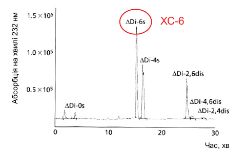 ХС-4 відіграє важливу роль у метаболізмі як хрящової, так і кісткової тканини, а його втрата має важливе значення у розвитку ОА. У відновленні ХС-4 важливу роль відіграє препарат ХС-4 та ХС-6. ХС-4 та ХС-6 (Структум) — єдиний хондроїтин сульфат пташиного походження визначається високим вмістом ХС-4 (72%), сульфатованістю (100%), низькою молекулярною масою (13 кДа), високим вмістом хондроїтин сульфату (99%) (тоді як у харчових добавках його кількість становить від 0–1 до 47% (Volpi N., 2009)), високою очисткою діючої речовини, що визначає його високу біодоступність та високу безпеку. У дослідженні N. Volpi (2009), результати якого наведено на рис. 8, показано, що ХС пташиного походження має найвище співвідношення ХС-4 і ХС-6 серед інших ХС, тобто ХС-4 перевищує за вмістом ХС-6 у 3–4 рази. Водночас у ХС акулячого походження це співвідношення становить усього 0,7, тобто вміст ХС-6 переважає над вмістом ХС-4. Слід відзначити, що в бичачому ХС співвідношення ХС-4 і ХС-6 становить 1,5–2 і вміст ХС-4 значно нижчий за ХС пташиного походження. Акулячий хондроїтин сульфат: <0,7 ![]() ![]()