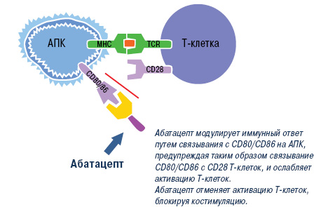 Рис. 1. Механизм действия ритуксимаба (адаптировано нами по: Cohen S.B. et al., 2006 [23]) Абатацепт. Согласно современным представлениям, Т-клетки также имеют фундаментальное значение в развитии РА, поэтому одним из важных направлений в лечении этого заболевания является подавление патологической активации Т-лимфоцитов [33, 71]. Установлено, что для оптимальной активации Т-лимфоцитов требуется, как минимум, два сигнала. Один из них реализуется в процессе взаимодействия Т-клеточных рецепторов с молекулами главного комплекса гистосовместимости (ГКГ), которые экспрессируются на мембране антигенпрезентирующих клеток (АПК), другой — за счет взаимодействия так называемых костимулирующих рецепторов на Т-клетках и соответствующих лигандов на АПК [72]. Ключевой костимуляторный сигнал обеспечивается за счет взаимодействия CD28 на Т-лимфоцитах и СD80/СD86 на АПК. CD28 постоянно экспрессируется на наивных CD4+ и CD8+ Т-клетках, а CD80 и CD86 — только после стимуляции АПК. При наличии обоих сигналов Т-лимфоциты подвергаются пролиферации и синтезируют цитокины, которые, в свою очередь, активируют другие клетки иммунной системы, и прежде всего макрофаги. В отсутствие костимуляторного сигнала Т-лимфоциты теряют способность эффективно отвечать на антигенные стимулы и подвергаются апоптозу. Наиболее мощным физиологическим ингибитором взаимодействия CD28–CD80/CD86 является CTLA4 (cytotoxic T-lymphocyte-associated antigen 4) — рецептор для CD80/CD86, который экспрессируется после активации АПК и взаимодействует с этими лигандами с более высокой авидностью (примерно в 500–2500 раз выше), чем CD28. Эта молекула рассматривается, как негативный регуляторный рецептор, который ограничивает неконтролируемую активацию Т-клеток в процессе иммунного ответа. Эти патогенетические данные послужили основанием для разработки нового препарата абатацепт, представляющего собой растворимую гибридную белковую молекулу, состоящую из двух компонентов — внеклеточного домена CTLA4 человека и модифицированного Fc (CH2 и CH3 области) фрагмента IgG1. Модификация Fc фрагмента обеспечивает низкую способность абатацепта индуцировать комплементзависимые и антителозависимые клеточные цитотоксические реакции. Как и нативный CTLA4, этот белок связывается с более высокой авидностью с CD80/86, чем с CD28, и блокирует активацию Т-клеток (рис. 2). По данным экспериментальных исследований, абатацепт подавляет развитие коллагенового артрита (классическая лабораторная модель РА у человека) при введении препарата во время иммунизации лабораторных животных коллагеном и замедляет прогрессирование артрита при введении на фоне его развития [68]. Абатацепт был одобрен в США и Европе в 2005 г. для лечения РА у взрослых пациентов с неадекватным ответом на DMARDs или ингибиторы ФНО-α. В январе 2010 г. он был одобрен в Европе для ювенильного артрита умеренной и тяжелой степени у больных в возрасте ≥6 лет.
