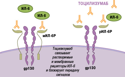 Рис. 2. Механизм действия абатацепта. TCR — рецептор Т-клетки; МНС — большой комплекс гистосовместимости В исследовании R. Westhovens и соавторов (2009) [70] была продемонстрирована долгосрочная эффективность и безопасность абатацепта в течение 5 лет в дозе 10 мг/кг массы тела. Препарат хорошо переносился, способствовал реальному снижению активности заболевания, был безопасен. Эти данные в сочетании с относительно высоким уровнем приверженности лечению обеспечивают клинические преимущества абатацепта при РА. Кроме того, продемонстрировано, что абатацепт обеспечивал клинический эффект у пациентов с РА, ранее применявших блокаторы ФНО-α без достижения целевых результатов; при этом абатацепт был эффективен у всех пациентов, независимо от ингибитора ФНО-α, которые применяли на предыдущем этапе лечения. Этот факт позволяет предположить, что переход на абатацепт может оказаться полезным и для пациентов, не ответивших на лечение ингибиторами ФНО-α. Тоцилизумаб. Тоцилизумаб представляет собой гуманизированные моноклональные антитела (IgG1), которые связываясь с мембранными и растворимыми рецепторами ИЛ-6, ингибируют оба сигнальных пути ИЛ-6-зависимой клеточной активации [47] (рис. 3). Тоцилизумаб — первый и единственный препарат, обладающий способностью подавлять ИЛ-6-зависимые воспалительные реакции, разрешенный к применению при заболеваниях человека. В настоящее время программа клинических исследований тоцилизумаба включает около 4 тыс. больных РА, что позволяет составить определенное впечатление не только об эффективности, но и о безопасности этого препарата [36]. Тоцилизумаб при применении в монотерапии или в комбинации с метотрексатом продемонстрировал превосходство монотерапии в сравнении с метотрексатом и способствовал статистически значимому снижению активности РА в течение 24 нед [36]. Тоцилизумаб также продемонстрировал эффективность у пациентов с РА, не достигших адекватного ответа или прервавших лечение ингибиторами ФНО-α [26].