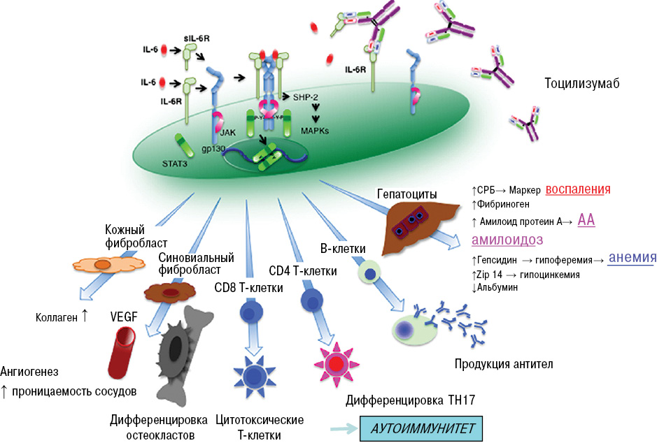 Рис. 2. Плейотропные эффекты ИЛ-6 Как видно из рис. 1, в патогенезе РА играют роль как клеточная цитотоксичность, за счет цитокинов: фактора некроза опухоли (ФНО)-α, интерлейкина (ИЛ)-1, ИЛ-6, так и гуморальный иммунный ответ, за счет ИЛ-4, -6, -10, то есть ИЛ-6 в развитии РА участвует как в клеточном, так и в гуморальном иммунном ответе (Olsen N.J. et al., 2014). В связи с чем можно предположить, что его блокирование может привести к более существенному снижению активности и прогрессирования заболевания. На рис. 2 убедительно показано влияние ИЛ-6 на реагенты воспаления: СРБ и фибриноген (увеличение их) и увеличение синтеза амилоида АА, гепсидина, что приводит к развитию анемии, увеличение синтеза аутоантител, развитие остеопороза, развитие ангиогенеза за счет увеличения сосудистого эндотелиального фактора роста, коллагенообразования — за счет повышения синтеза фибробластов и др. Поэтому в настоящее время ингибиторам ИЛ-6 в лечении РА уделяется большое внимание. Повышение уровня в сыворотке крови ИЛ-6 и растворимых рецепторов ИЛ-6 коррелирует с активностью процесса при РА. Успешное лечение тоцилизумабом (блокатор рецепторов к ИЛ-6) РА способствовало развитию исследований новых биологических агентов, нацеленных на ИЛ-6 и ИЛ-6R. Проведение сравнительных исследований по эффективности новых биологических агентов, нацеленных на ИЛ-6 и ИЛ-6R, с тоцилизумабом показало аналогичный клинический эффект по АСR20. Как видно из представленной табл. 3, проходят клиническое испытание четыре новых блокатора ИЛ-6. Таблица 3